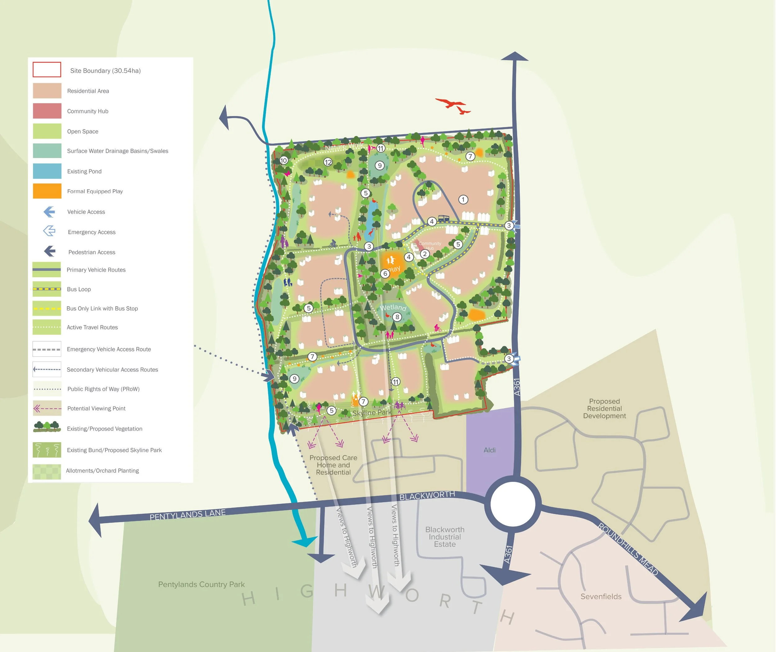 The layout prioritises communities, with walkable neighbourhoods, well-connected routes and carefully designed access points from the A361.